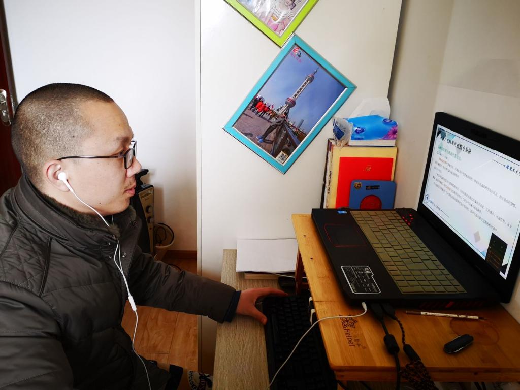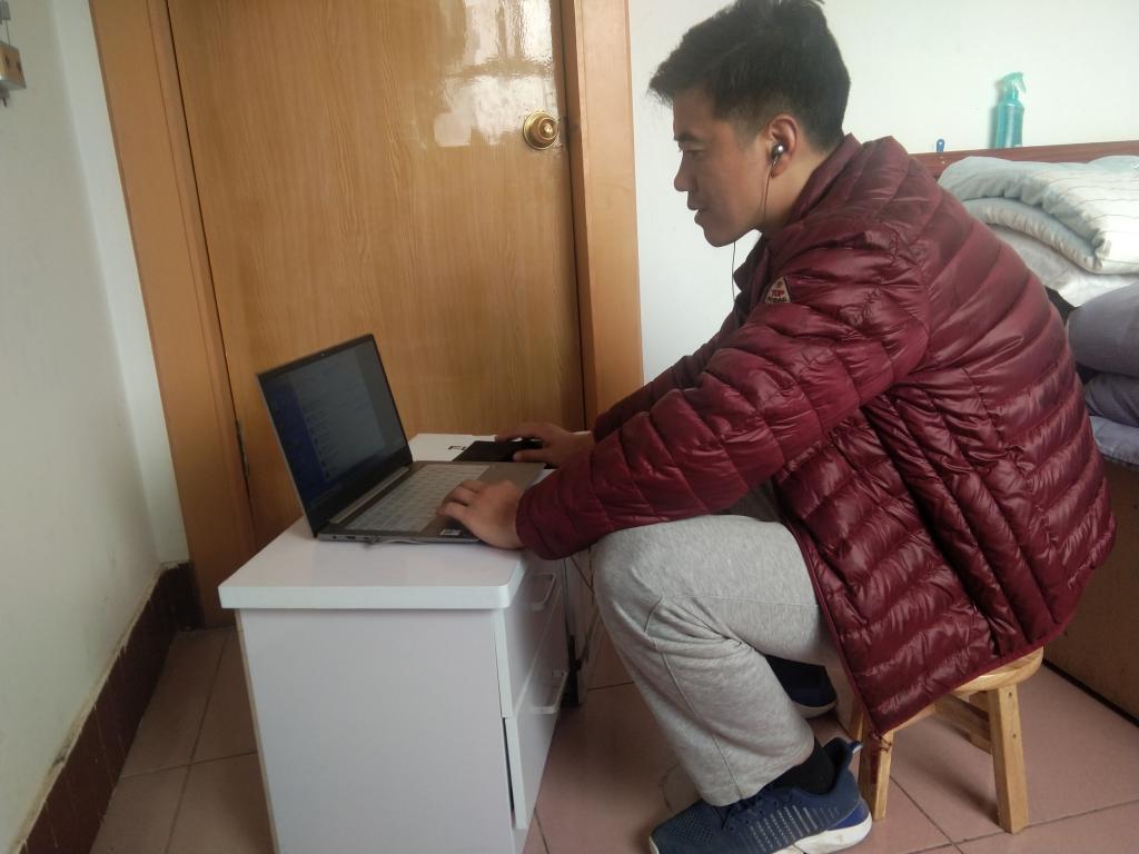 上!经过一个晚上的思考,王老师决定积极面对现存的各种问题,没有条件想办法创造条件,一定要保证按时开展在线教学工作。没有电脑,立即在京东商城买;没有网线、路由器就到村里面其他人家去借;没有专用空间,就在卧室里面坐在小板凳上,电脑放到床头柜上;没有安静的授课环境,每次上课时就让家人带着3个小孩到家外边玩;没有课件资源,就联系校内的老师到其住所打开电脑把课件发过去……,经过认真的准备,终于克服了各种困难,保证了在线授课的顺利进行。