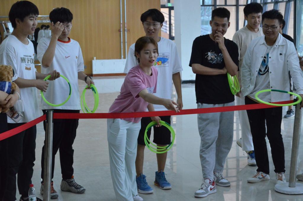 全体同志到东扩区图书楼一楼大厅参与联谊活动素质拓展环节,有“乒乓接龙”“乾坤大挪移”“同心击鼓”“过砖桥”“套圈取物”5个环节。大家分为4个小组,各组成员都相互配合,相互帮助,不落下一个队员,坚持到底。