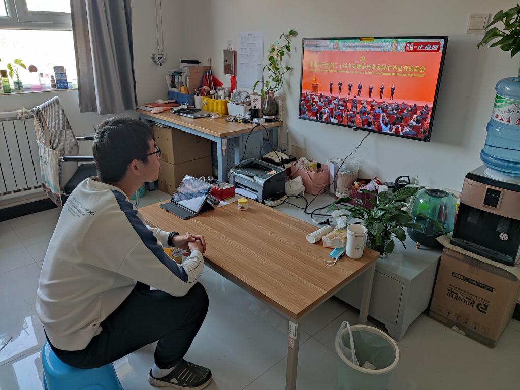 机械电气化工程学院电气工程系教师王建平在塔里木大学教工11-3-505观看第二十届中央政治局常委记者见面会