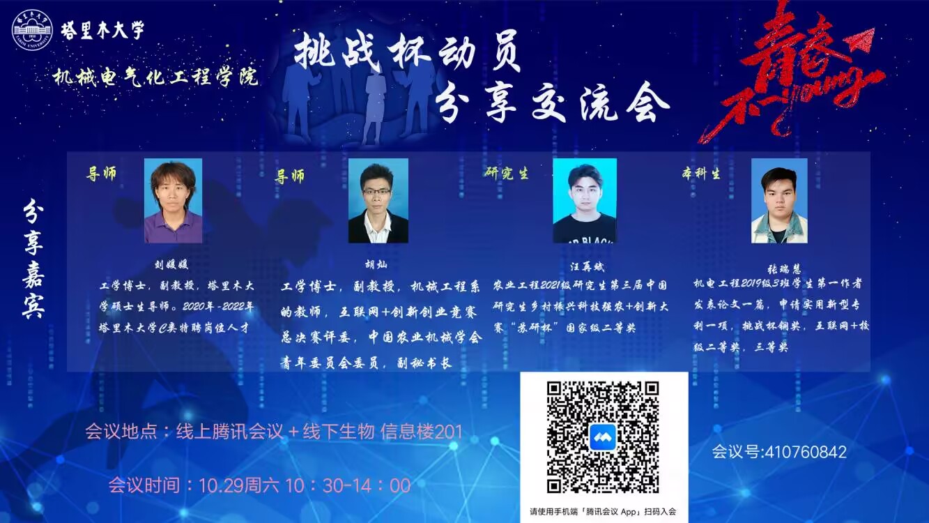 为增进同学们对“挑战杯”大学生课外学术科技作品竞赛的认识和了解,激发参与“挑战杯”竞赛的热情,10月29日,学院采用线上线下相结合组织开展“挑战杯动员·经验分享交流会”活动。学院党委副书记李勇、教务办公室主任童荣、团委副书记高秋玲、辅导员张哲,以及线上线下600余名学生参加。活动邀请导师代表刘媛媛副教授、胡灿副教授,学生代表汪再斌、张瑞慧进行经验分享交流。活动由高秋玲主持。