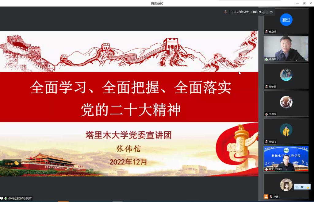 张伟信以以“全面学习、全面把握、全面落实党的二十大精神”为主题,结合自身学习感悟、工作实践,围绕党的二十大召开的重大意义、深刻理解党的二十大精神的核心要义、习近平新时代中国特色社会主义思想在塔里木大学的生动实践、党的二十大精神在塔里木大学生根发芽、开花结果四个部分结合做好当前有关重点工作,对党的二十大精神进行了全面深入的解读。