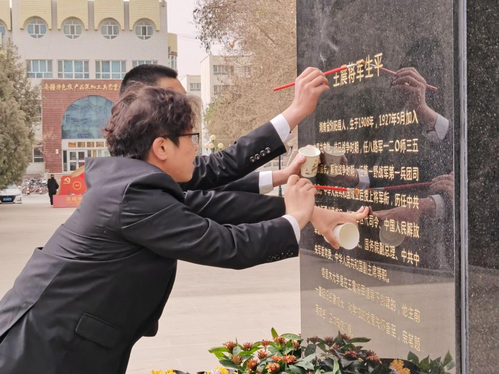 各位同志在王震将军铜像前行鞠躬礼、默哀并依次敬献鲜花,向王震将军及革命先烈表达深切的缅怀和崇高的敬意。随后同志们用毛笔刷细心抹去纪念碑的灰尘,每一笔每一划,都凝聚着对革命先烈的崇敬之情。
