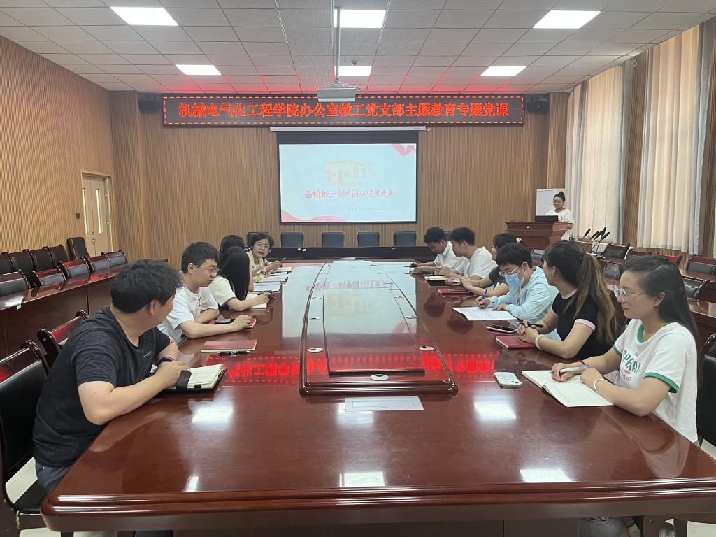 为进一步推进学习贯彻习近平新时代中国特色社会主义思想主题教育走深走实,学院组织开展支部书记专题党课交流分享活动,6月15日,办公室教工党支部书记高秋玲作题为“西柏坡 新中国从这里走来”的专题党课,支部全体党员参加,专题党课在D108会议室开展。