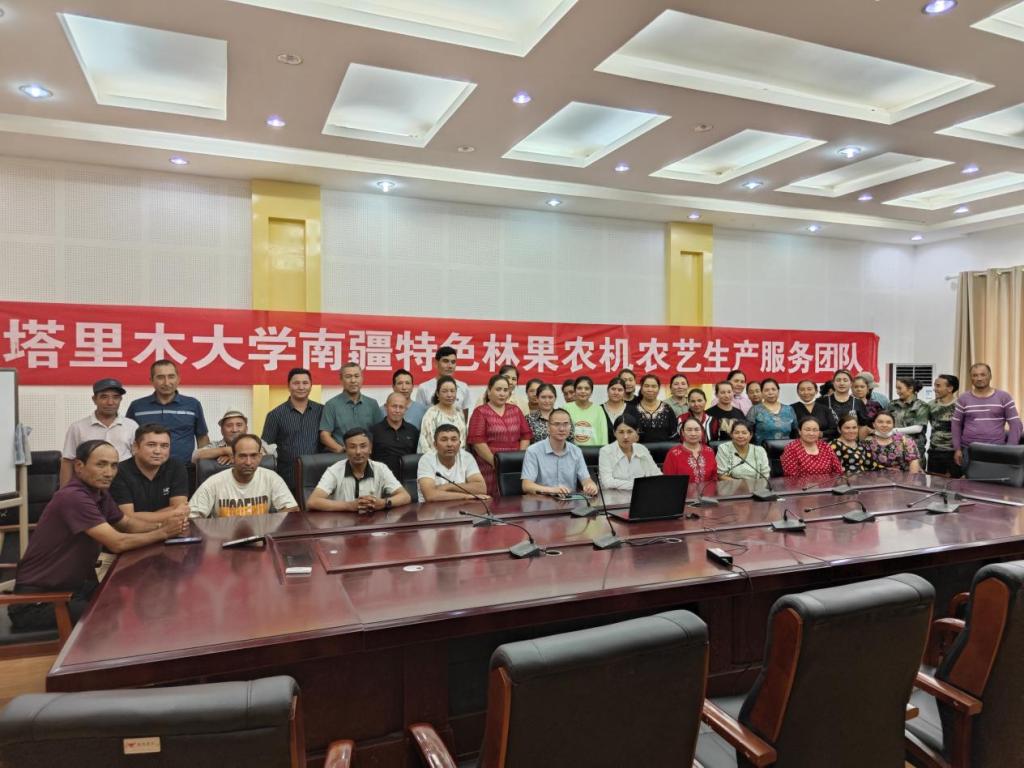 团队在十四师皮山农场农发中心吐泥沙古丽的协助翻译下,就新疆香梨、苹果、红枣等主要水果的种植规模和种植模式对当地农户进行了培训。主要包括品种选择、育苗及嫁接技术;林果肥水管理及不同树龄修剪技术;果树整形修剪、有害生物防治及林—饲间作一体化管理等技术培训。会议上村民们仔细聆听讲座,联系当下生产实际中遇到的问题进行了提问,团队成员针对农户提出的问题进行了热心讲解。