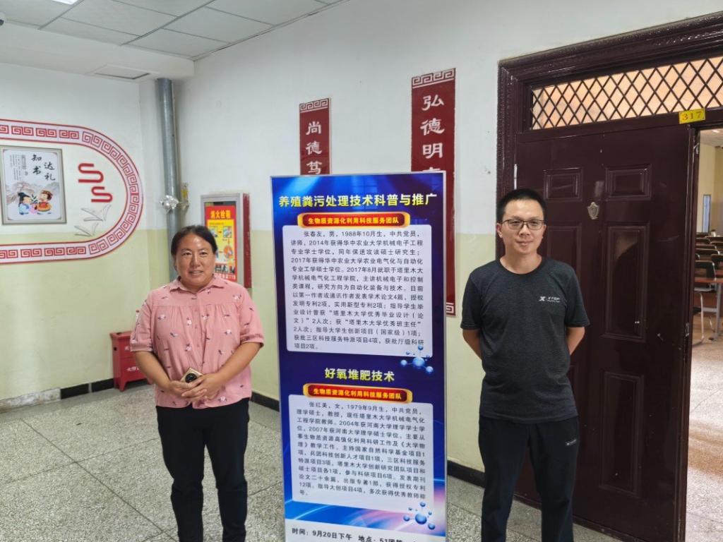 张春友老师率先做了“生物质资源化利用技术与装备”科普报告,播放了精心制作的科普视频;随后张红美教授做了“南疆生物质资源化利用技术服务知识之好氧堆肥技术”的报告。内容深入浅出,将党和国家的大政方针和南疆本地的农牧产业紧密联系在一起。强调党和国家对国民生活环境和生活水平的重视,介绍了团队围绕农林剩余物资源化开展的一系列科学研究和成果示范工作,讲解了农林剩余物处置不当的危害和典型事故案例;报告内容接地气,与现场师生的生活环境紧密联系,学生积极互动发言,现场氛围热烈!