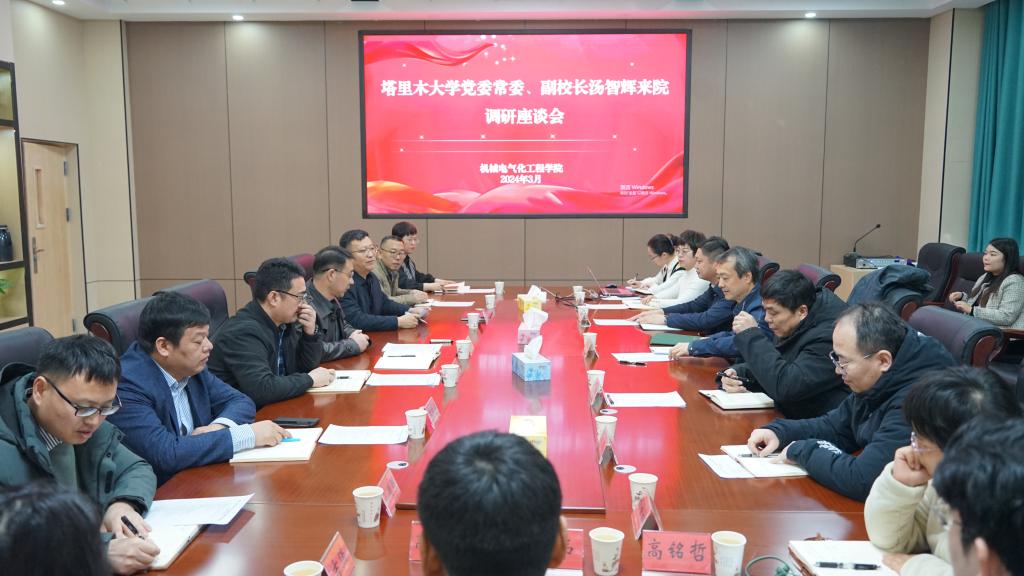 3月4日上午,塔里木大学党委常委、副校长汤智辉、资产管理处处长龚平来院调研座谈。学院党委书记王旭峰,党委副书记、院长张宏,党委副书记、纪委书记李勇,各系、中心和办公室负责人,师生代表参加此次调研座谈会,座谈会由张宏主持。
