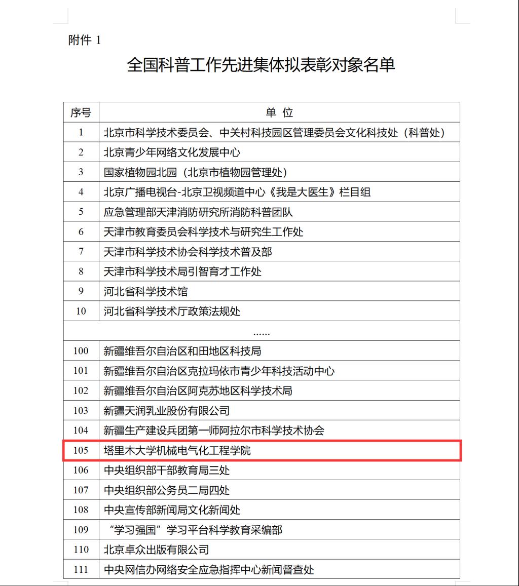 近日,科技部发布《关于对全国科普工作先进集体和先进工作者拟表彰对象名单进行公示的公告》,拟表彰塔里木大学机械电气化工程学院等196家全国科普工作先进集体和303名全国科普工作先进工作者。