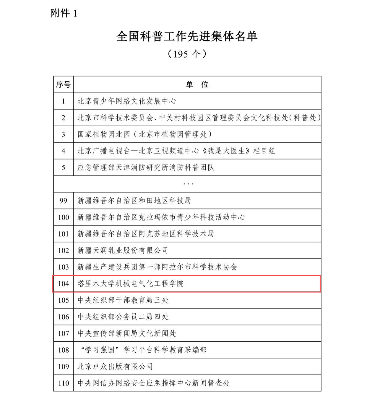 近日,科技部、中央宣传部、中国科协发布《关于表彰全国科普工作先进集体和先进工作者的决定》,对2020年以来在科普工作中作出突出贡献的195个单位和302名个人授予“全国科普工作先进集体”和“全国科普工作先进工作者”荣誉称号。其中,塔里木大学机械电气化工程学院喜获“全国科普工作先进集体”称号。