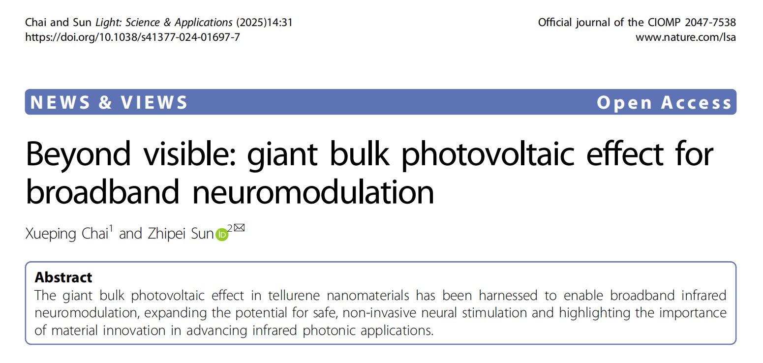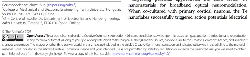 近日,塔里木大学机械电气化工程学院柴学平为第一作者,芬兰阿尔托大学电子工程学院孙志培教授为通讯作者在国际光学和光子学领域期刊《Light: Science & Applications》(Nature子刊,IF=20.6)发表了题为《Beyond visible: giant bulk photovoltaic effect for broadband neuromodulation》的研究论文。