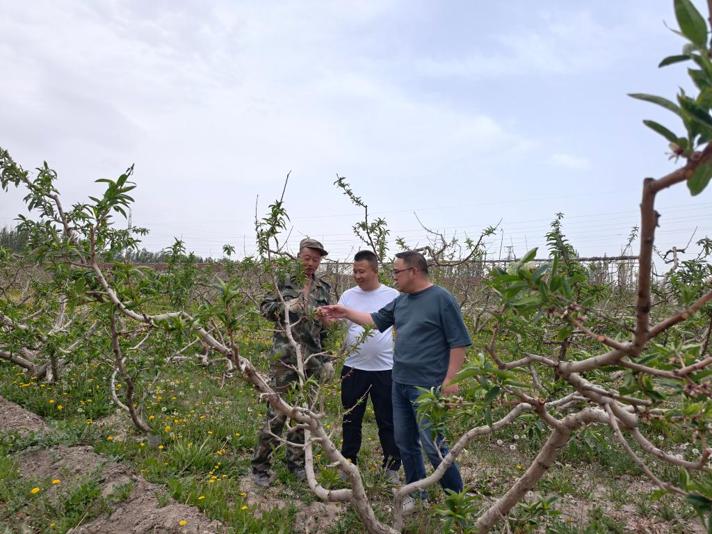 团队成员还围绕连队的桃树进行培训指导,目前是桃树生长的黄金期,就桃树夏剪控旺、疏果定果、肥水管理、防治病虫害、中耕除草、防裂果、防风害等进行指导,提高蟠桃产量和品质。