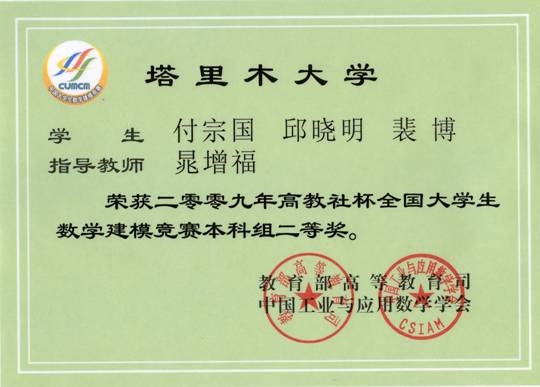 2009年全国数学建模竞赛塔里木大学机械电气化工程学院获奖情况: