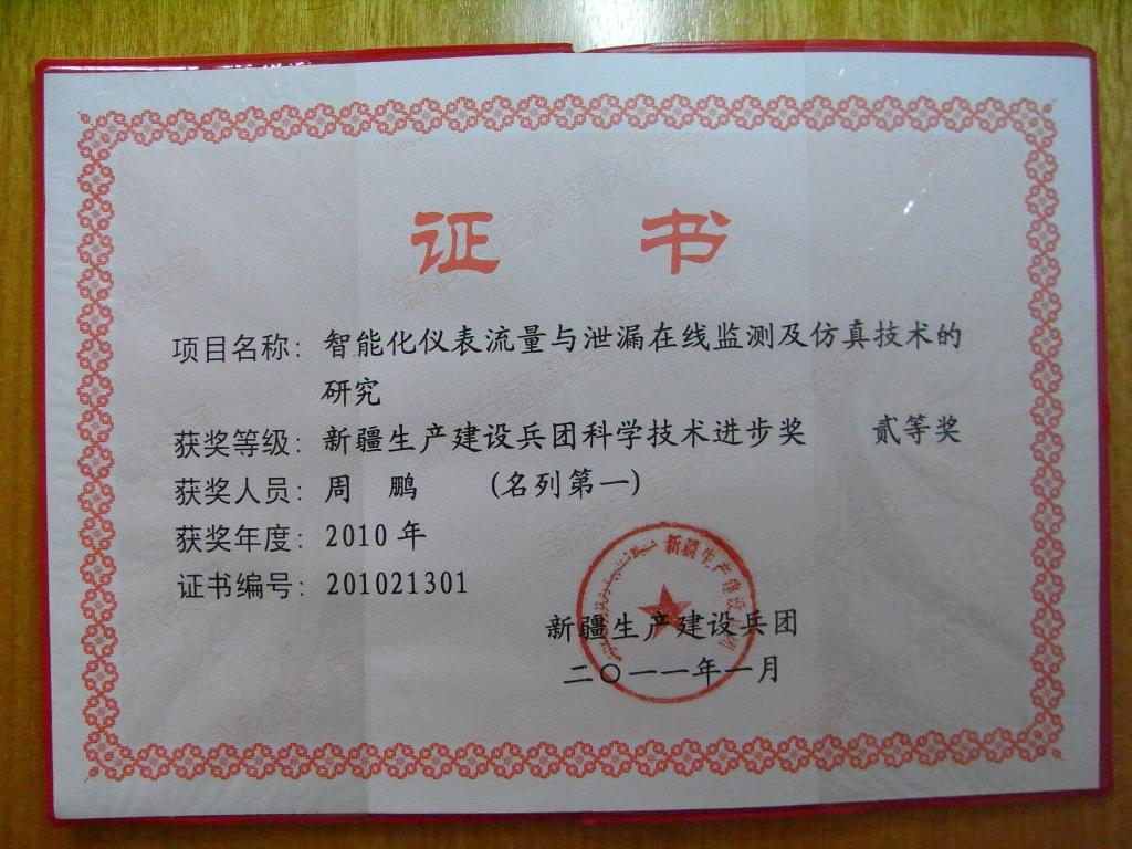 (3)2010年,周鹏、黄钢等,智能化仪表流量与泄漏在线监测及仿真技术的研究,新疆生产建设兵团科学技术进步二等奖