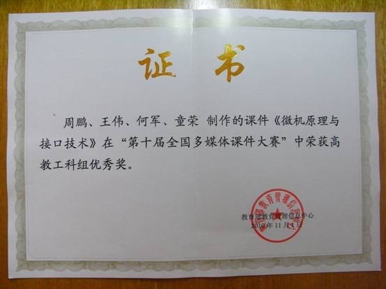(2)2010年,周鹏、王伟、何军、童荣,微机原理与接口技术,第十届全国多媒体课件大赛优秀奖